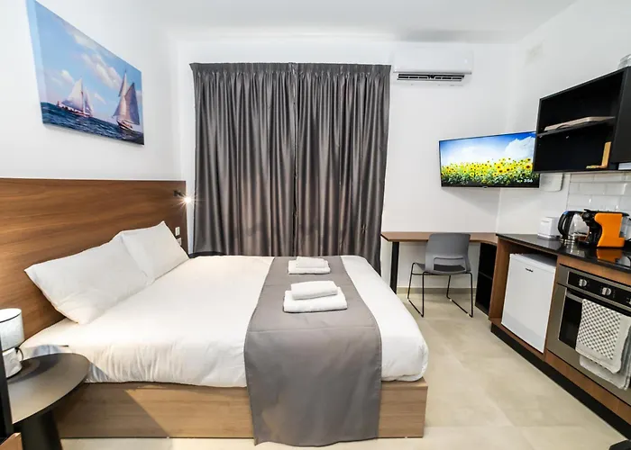 O New Luxury 1 Double Bed Studio Balcony - Bv2 St. Paul's Bay está localizado a aproximadamente 25 minutes a pé de Ilha de São Paulo e a uma distância de 4.5 km de Rotunda de Mosta.